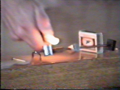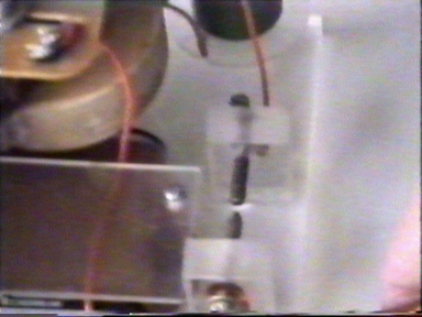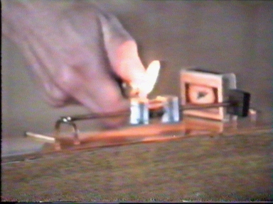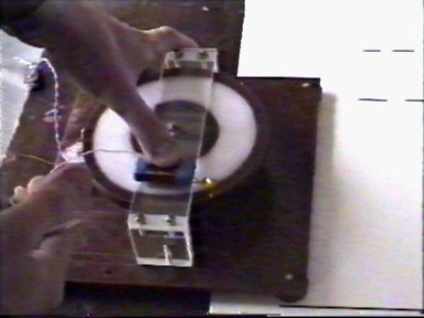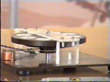 Two masses in center and spring between masses. Thread hold the spring.