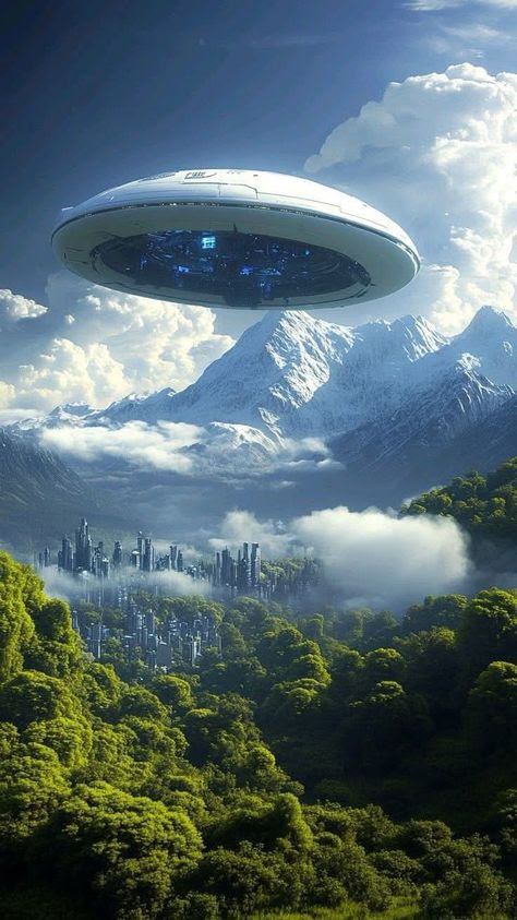 Spaceship over landscape.